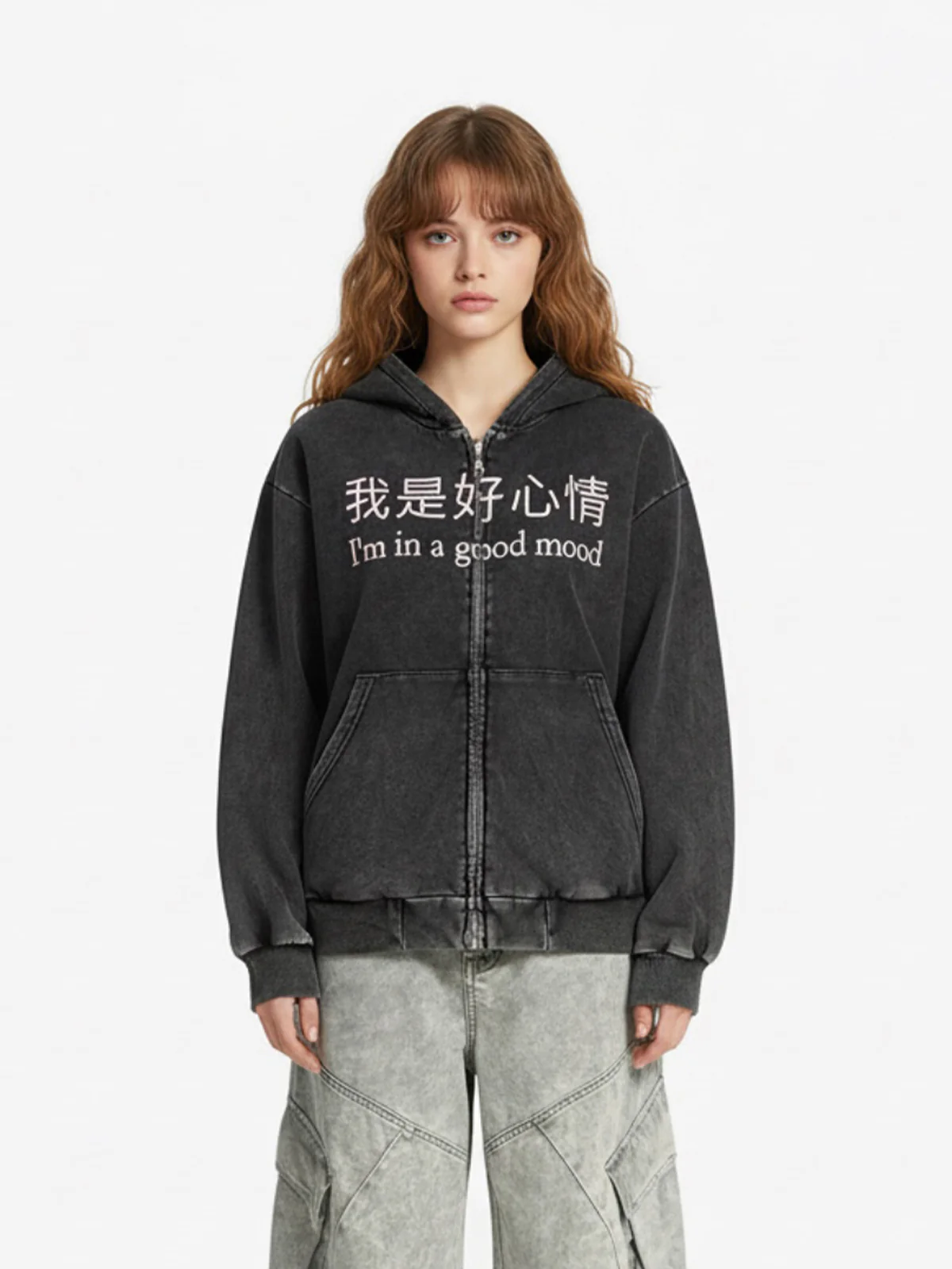 Retro Distressed Fun Text Print Zip-Up Hoodie