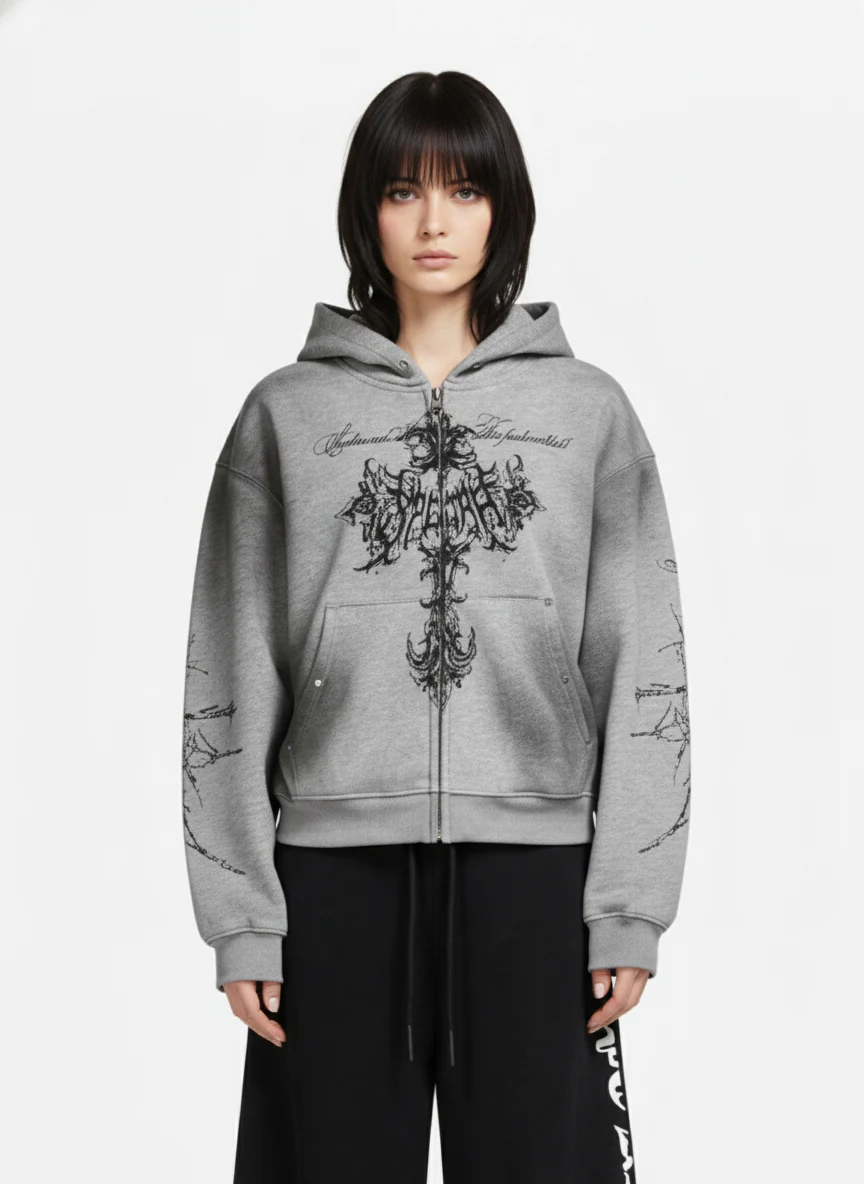 Street Wasteland Washed Cross Print Zip Up Hoodie