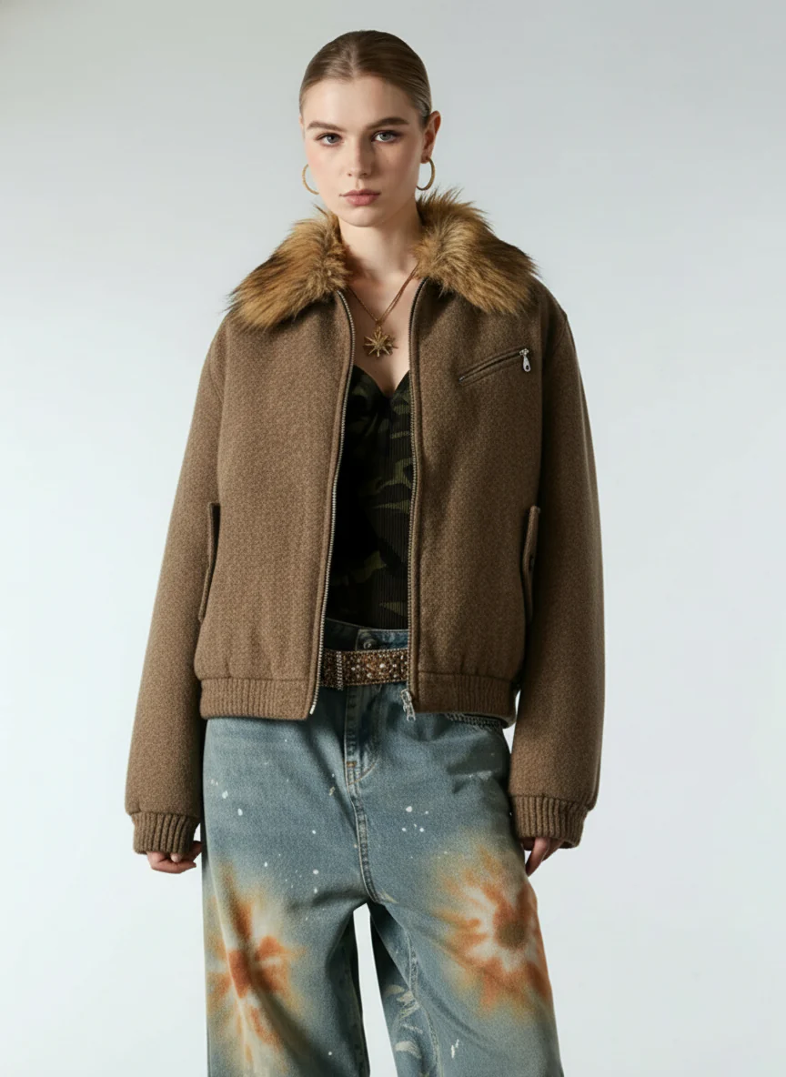 Retro Faux Fur Collar Wool Textured Zip Up Bomber Jacket