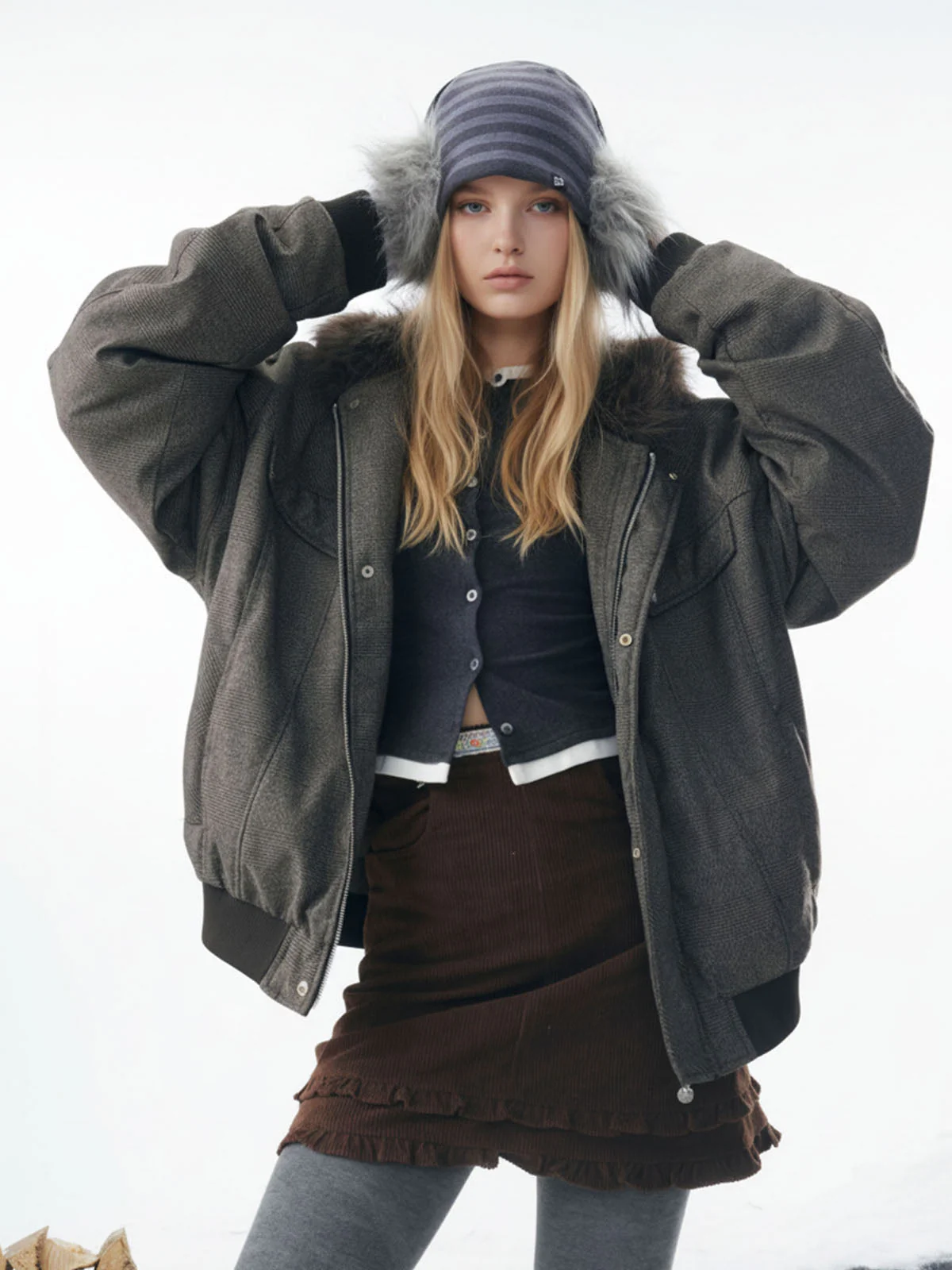 Retro Plaid Textured Faux Fur Collar Padded Bomber Jacket
