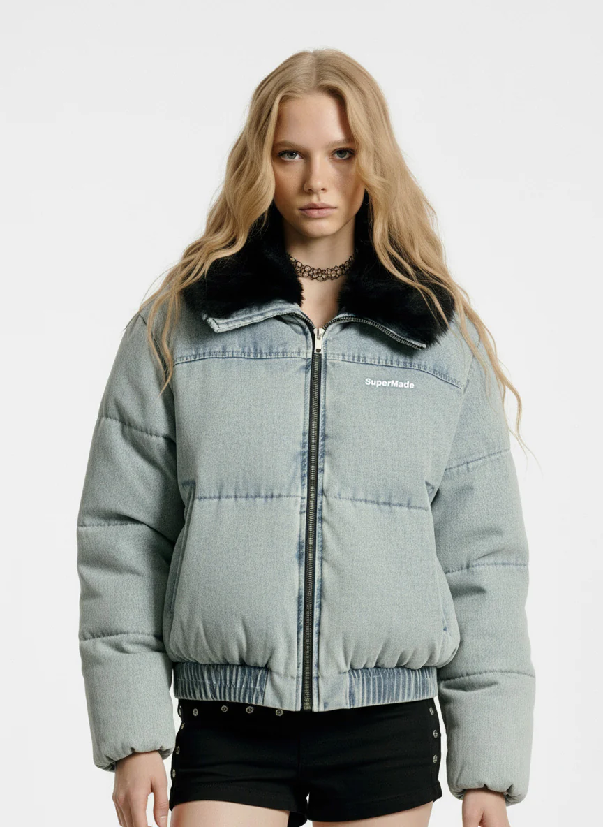 Retro Washed Denim Faux Fur Collar Quilted Jacket