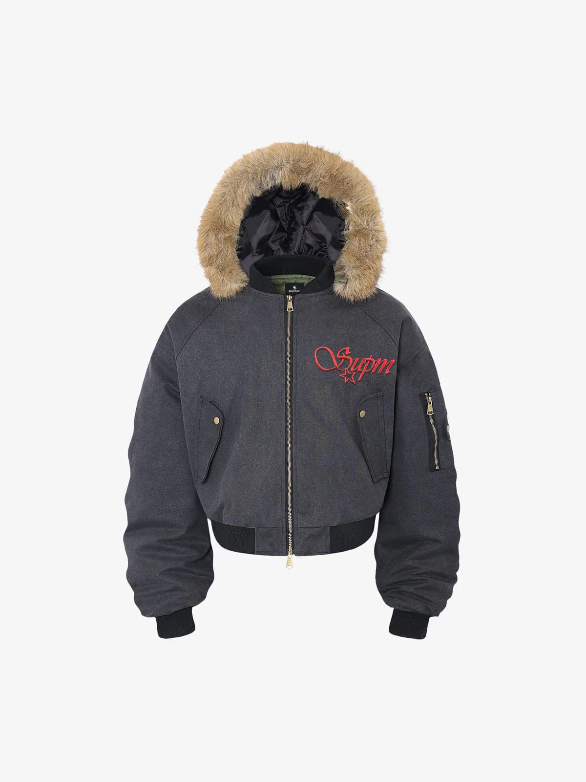 Retro Detachable Faux Fur Hood Zip-Up Bomber Jacket