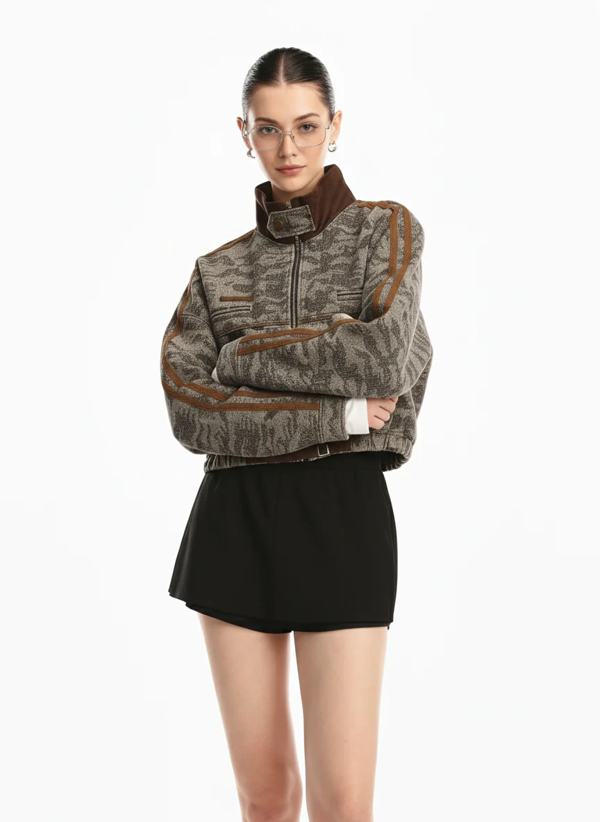 Camouflage Print Stand Collar Cropped Jacket