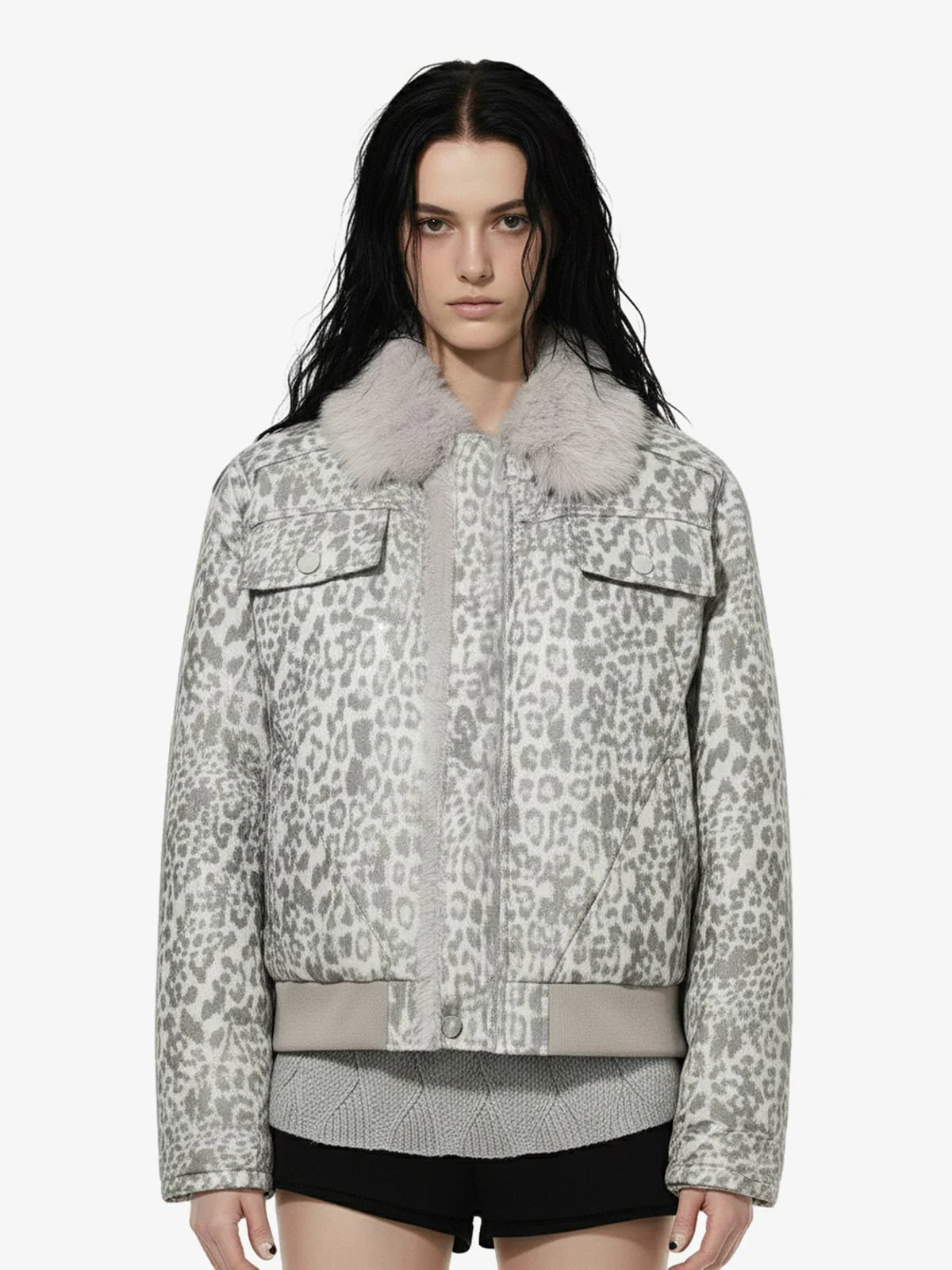 Leopard Panel Fur-Trim Hooded Bomber Jacket