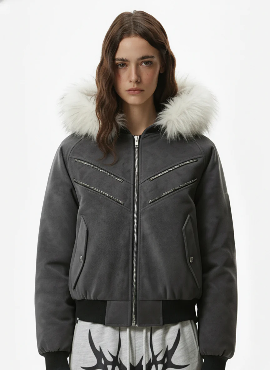 Faux Fur Trimmed Hood Suede Bomber Jacket