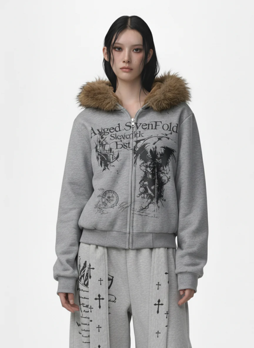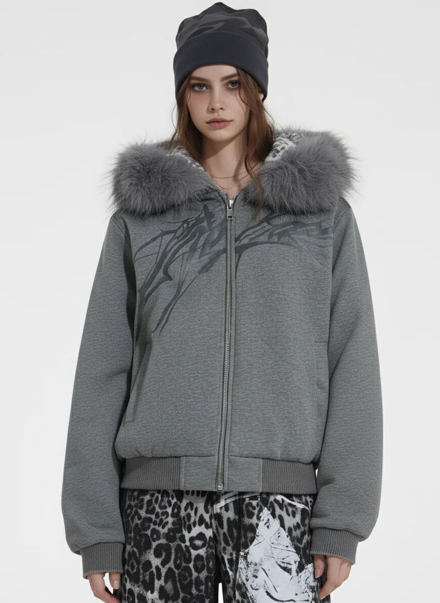 Detachable Fur Collar Gothic Graphic Fleece Lined Zip Up Hooded Jacket