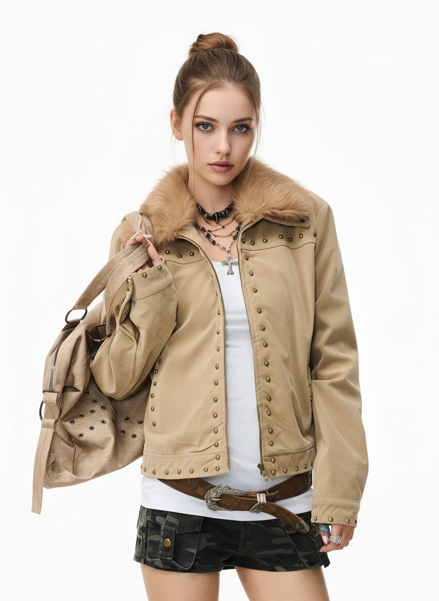 Vintage Suede Studded Faux Fur Collar Jacket