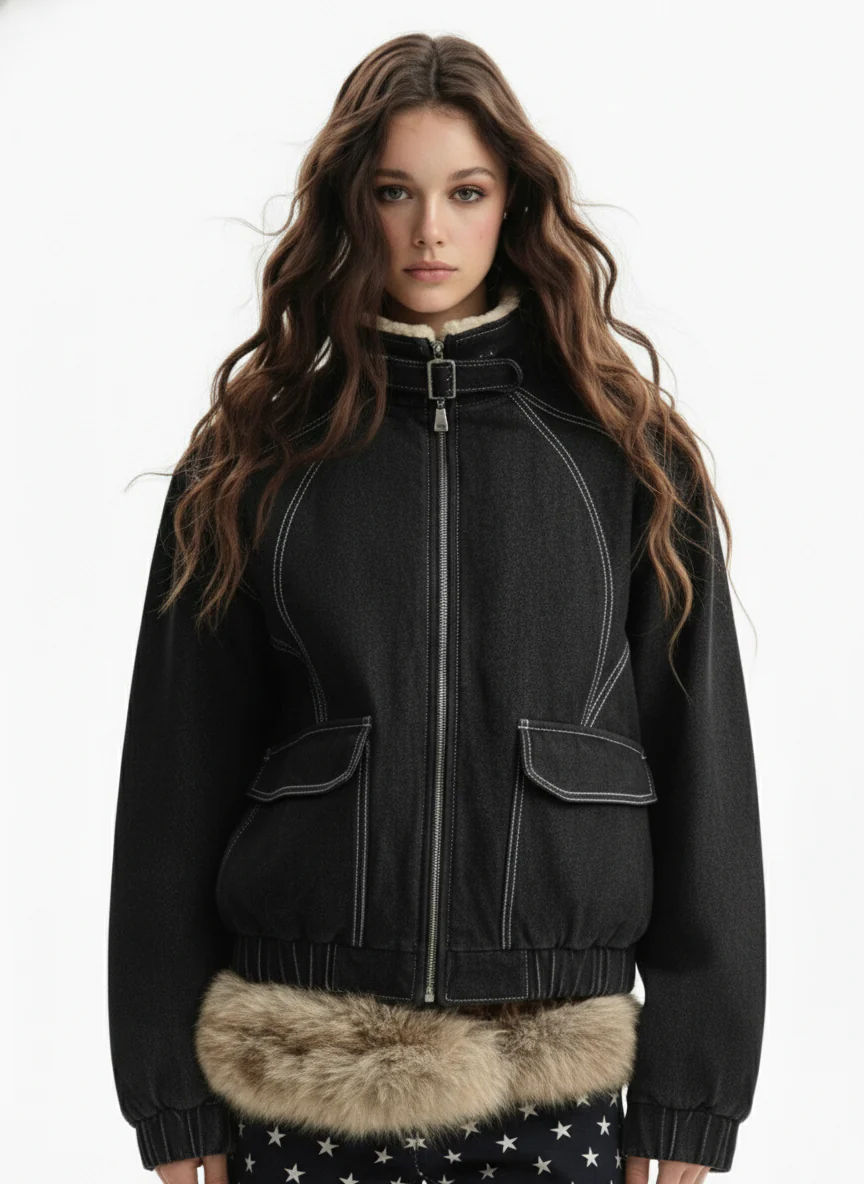 Street Dark Shadow Fur Collar Quilted Bomber Jacket