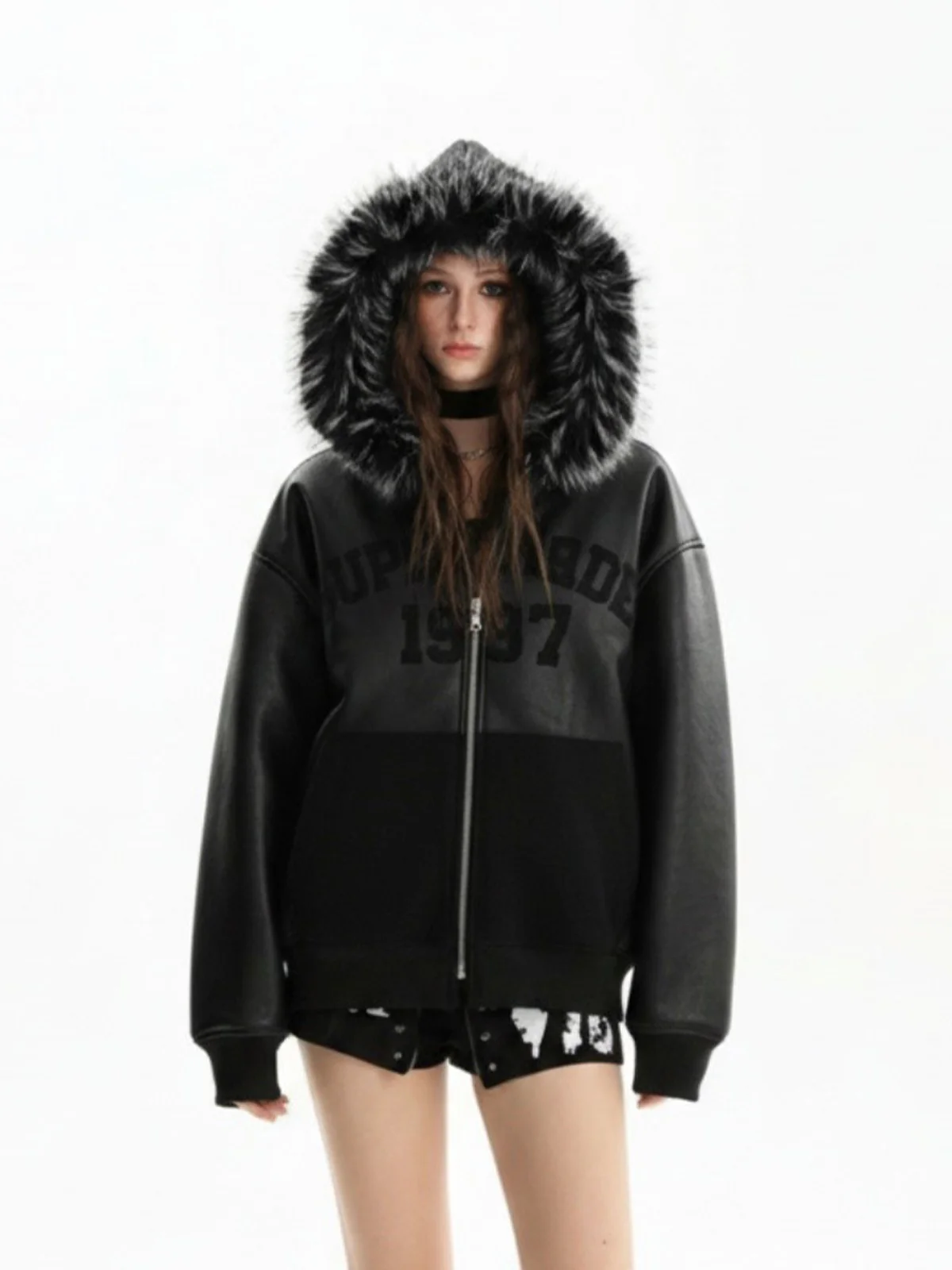 PU Leather Faux Fur Hooded Trim Fleece Spliced Zip Up Jacket