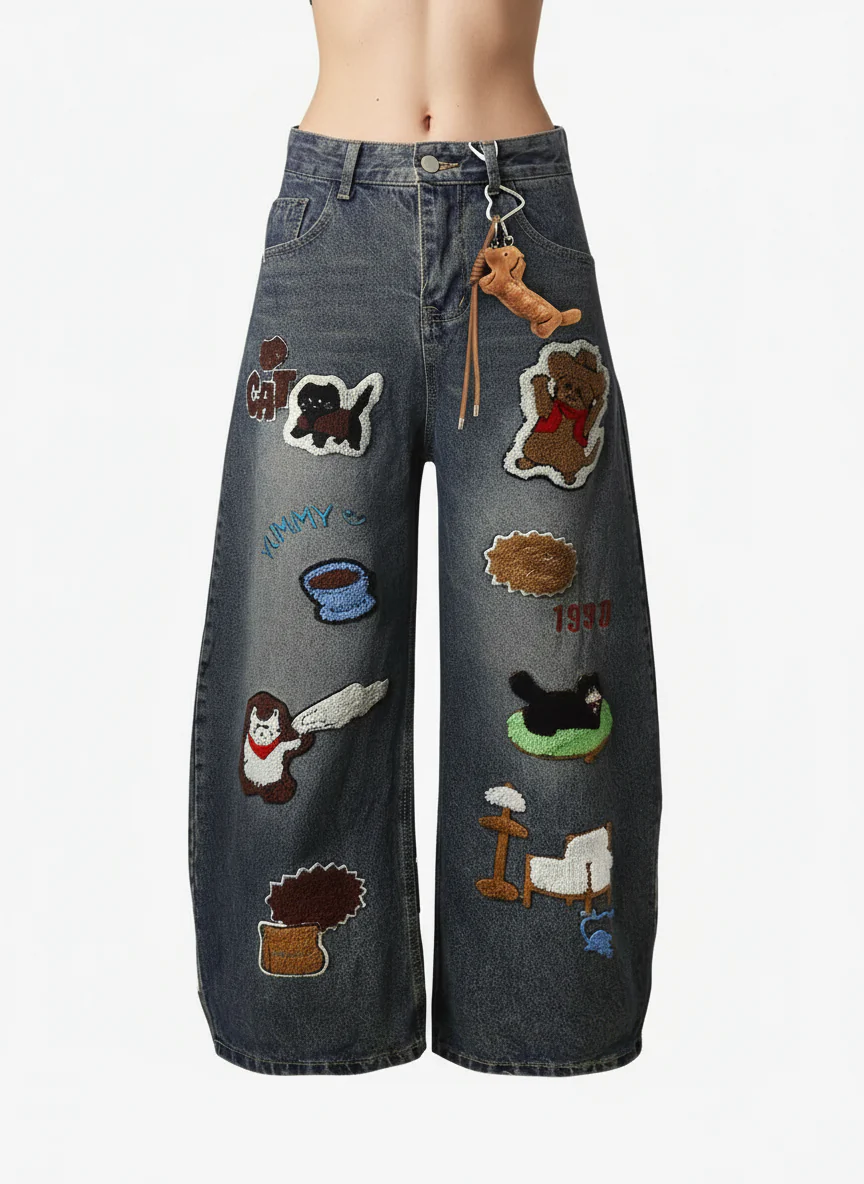 Retro Cartoon Graphic Heavy Embroidery Barrel Jeans