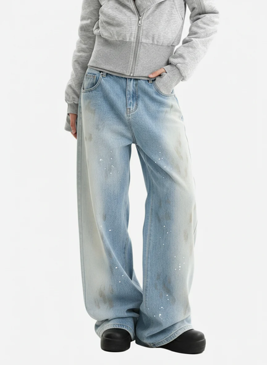 Vintage Heavy Splatter Washed Denim Wide Leg Jeans