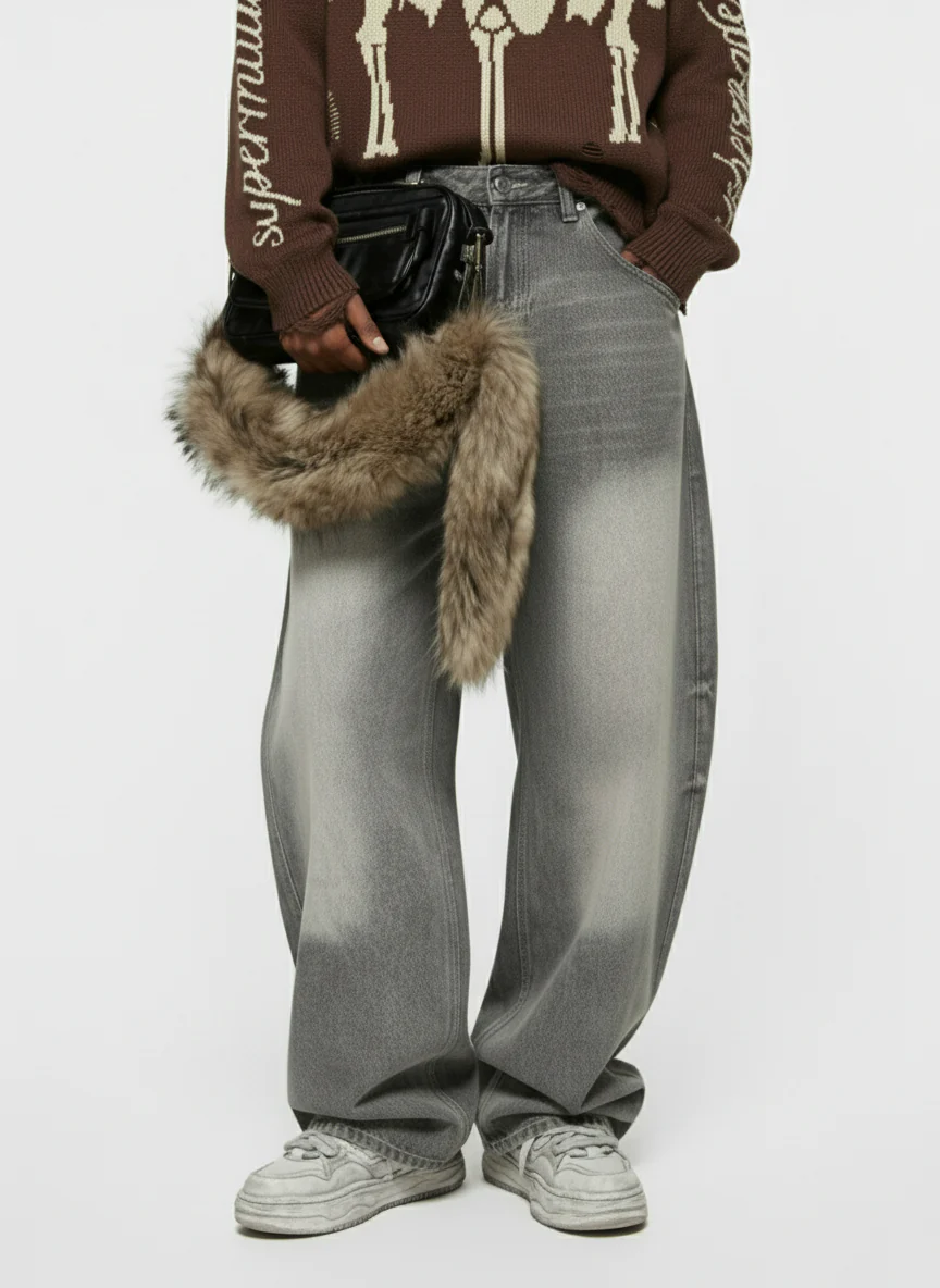Vintage Acid-Washed Multi-Pocket Wide-Leg Cargo Barrel Jeans
