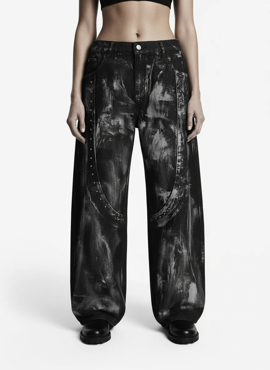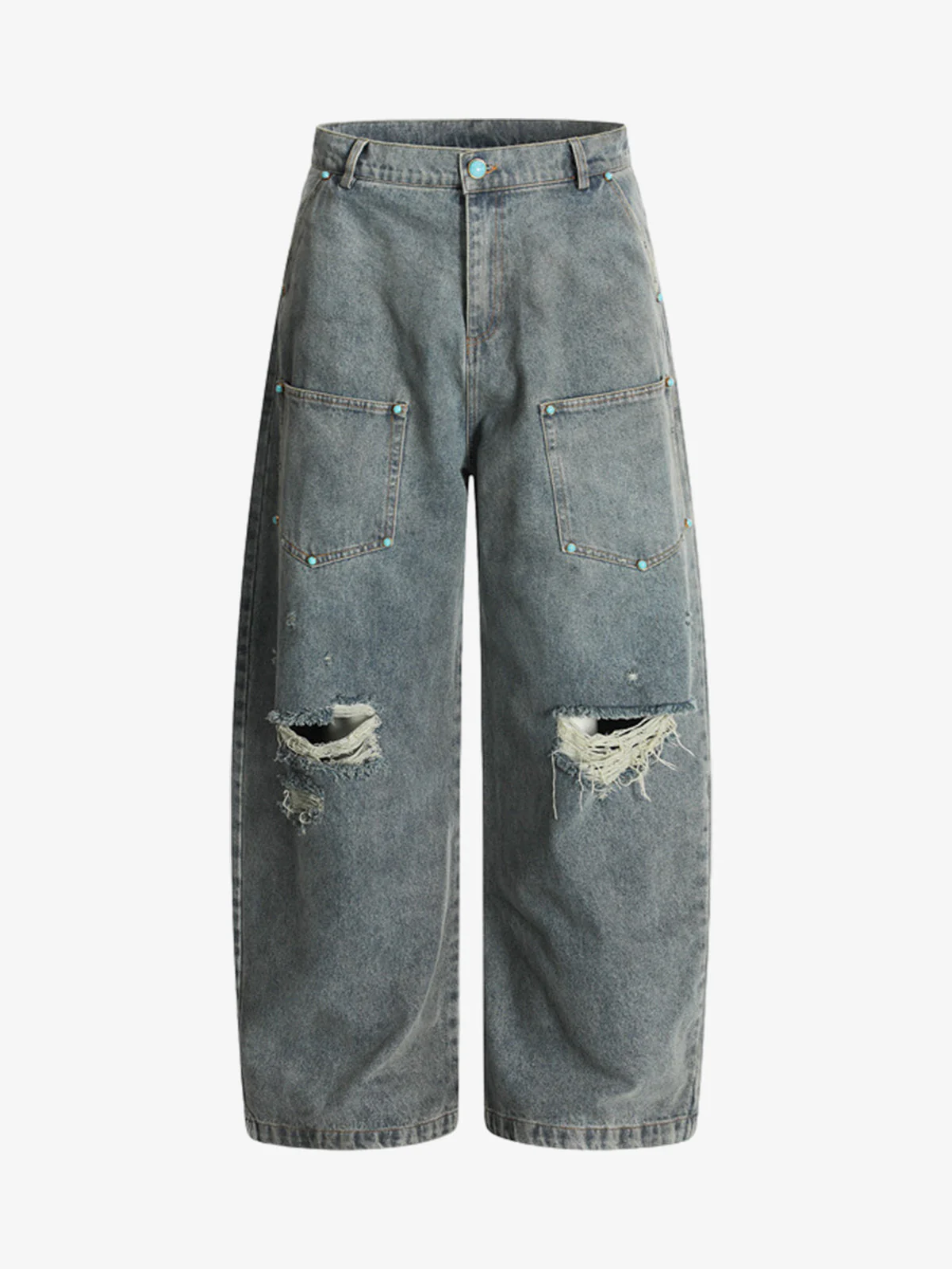 Distressed Rivet-washed Ripped Barrel Jeans