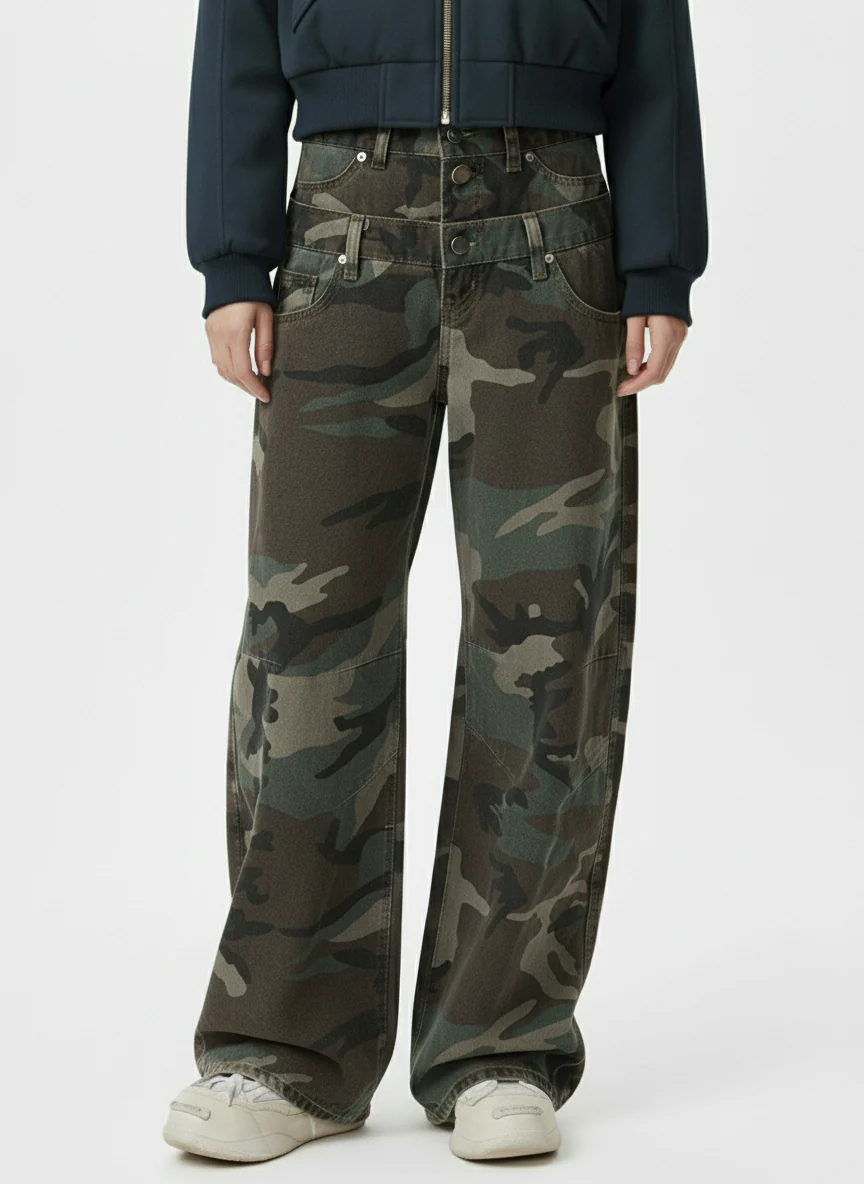 Retro Double Waist Camouflage Barrel Jeans