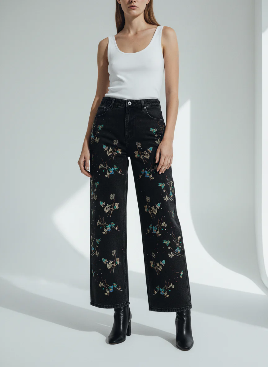 Vintage Floral Embroidery Rhinestone Straight Jeans