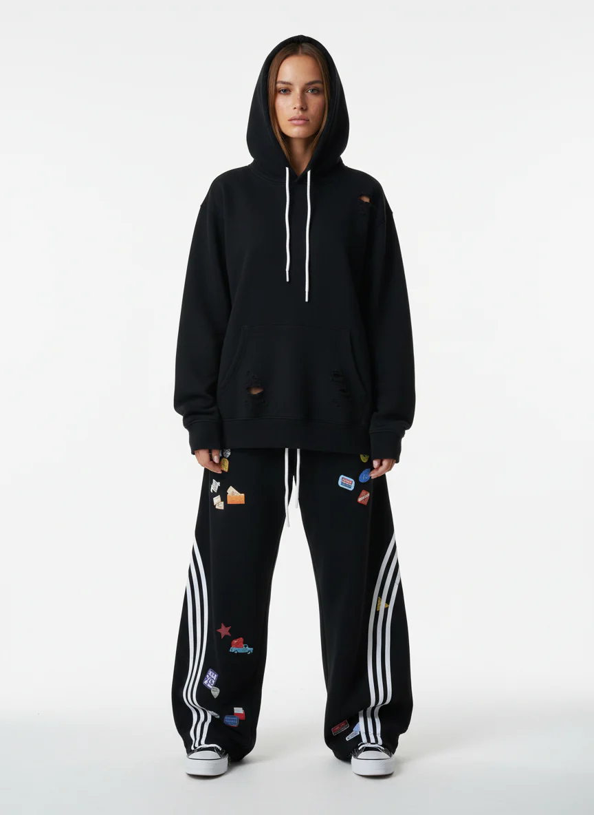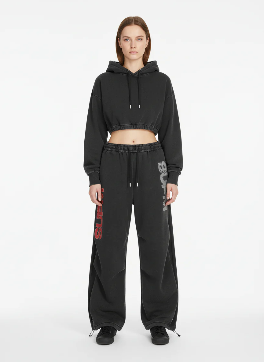 French Terry Distressed Gradient Drawstring Wide Leg Pants