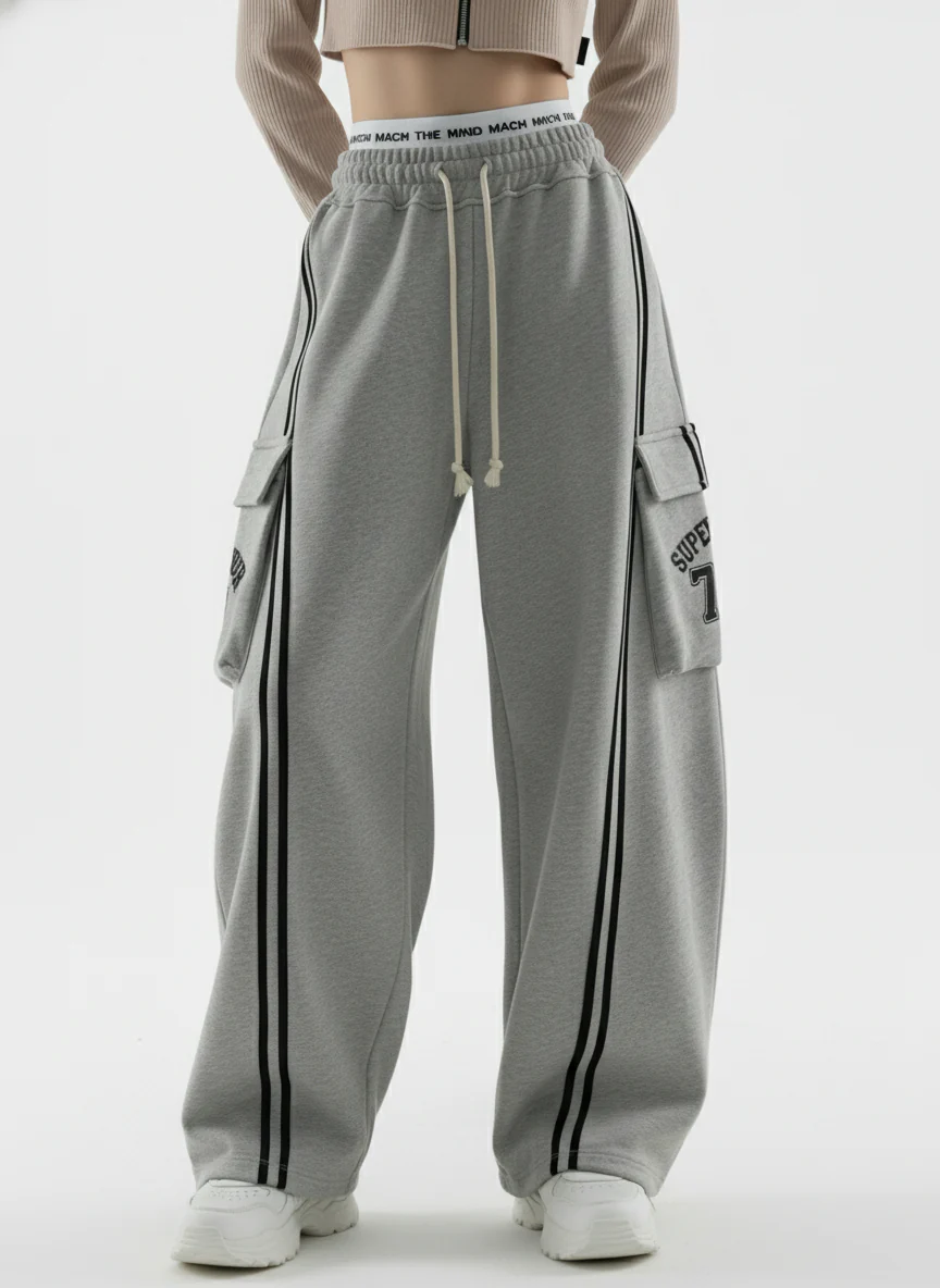 Cotton Web Stitching Letter Print Drawstring Barrel Pants